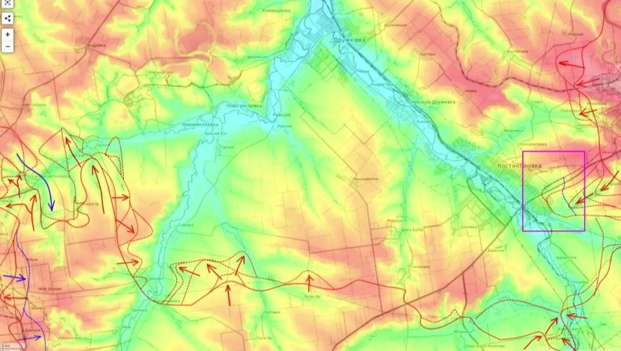 На Константиновском направлении российские войска продолжают атаки на южные окраины Константиновки, однако значительных прорывов пока не достигнуто. Противник оказывает упорное сопротивление, а по данным Подоляки, ВС РФ были вытеснены с восточных окраин города.