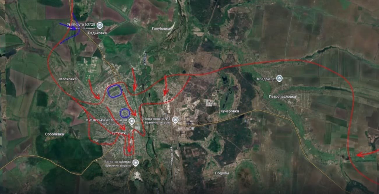 На Купянском направлении наступление российских войск здесь, по признанию Подоляки, застопорилось. Идут попытки выбить противника из западных районов города (правобережье), но для решительного удара, вероятно, потребуется перегруппировка.