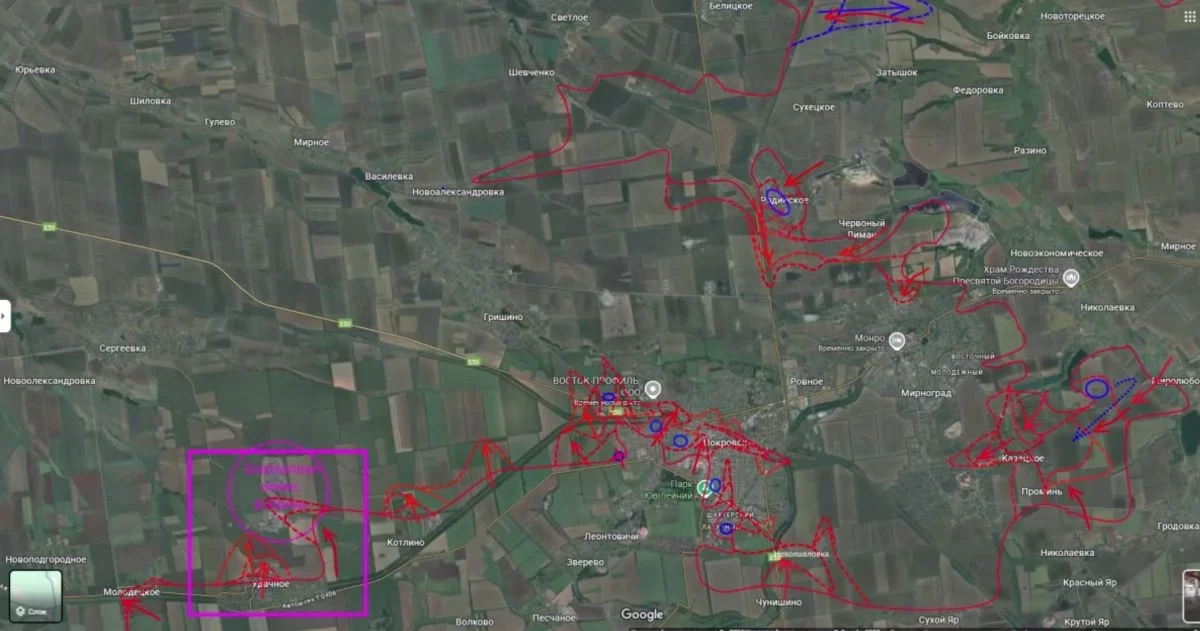 Основные события разворачиваются вокруг Покровской агломерации. Как отмечает Подоляка, оборона противника в самом Покровске, достигнув определенного предела, "начала сыпаться", что привело к быстрой "просадке" фронта.