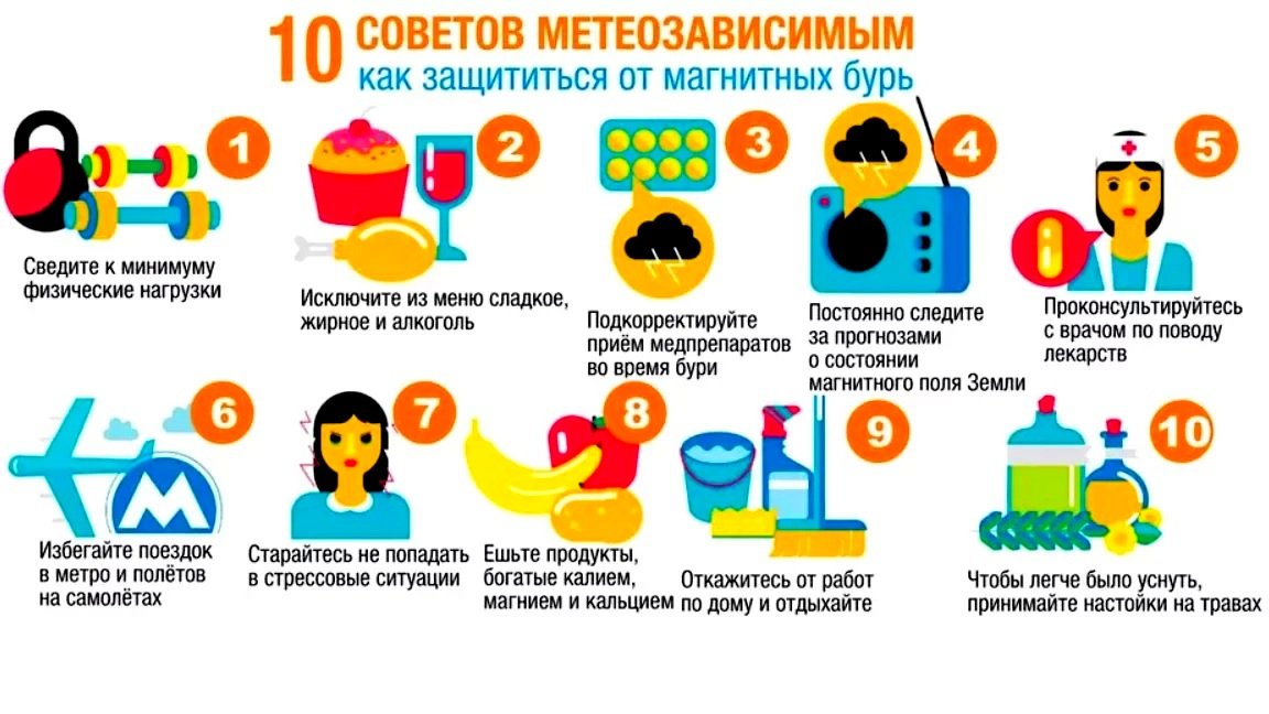 Кроме того, влиянию бурь подвержены те, чья работа связана с высокой концентрацией внимания, например, водители, авиадиспетчеры и врачи. Чтобы легче пережить этот сложный период, специалисты рекомендуют соблюдать несколько простых правил. Важно наладить режим сна, ложась спать не позже полуночи. Следует увеличить потребление воды и травяных чаев, исключив кофе и алкоголь. В рацион полезно включить продукты, богатые магнием и омега-3, такие как орехи, рыба и зелень. Помогут также короткие прогулки на свежем воздухе и снижение времени, проводимого перед экранами гаджетов.
