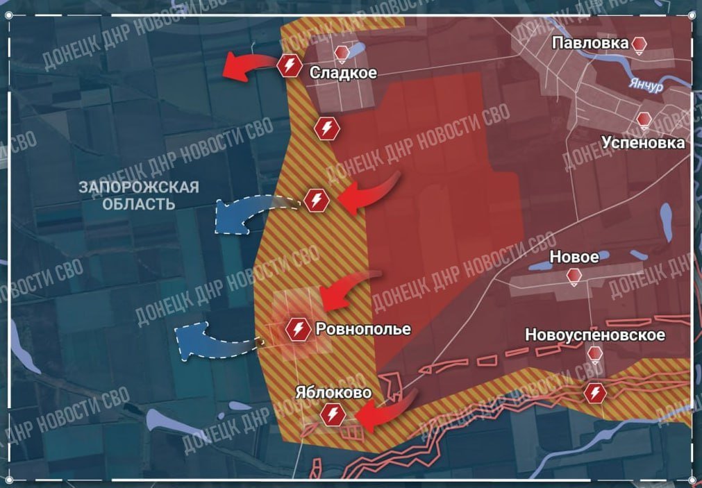 На Гуляйпольском направлении российские бойцы расширяют подконтрольную территорию в районе Нового, Сладкого, западнее Рыбного. Южнее Даниловки ВС РФ заняли новые позиции в лесополосах. В Орестополе противник вынужден оттягиваться с окраин, которые занимают наши штурмовики.