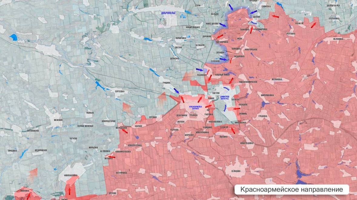 На Покровском участке фронте ВС РФ продвигаются со стороны Котлино к Гришино с юга. На восточной окраине этого села уже завязались бои. В Красноармейске наши бойцы постепенно подавляют оставшиеся очаги сопротивления ВСУ. Вокруг Димитрова наши замкнули кольцо окружения, а по крупным опорным пунктам врага в городе наши бьют ФАБ-3000. В районе Родинского ВСУ продолжают контратаки, наши войска были вынуждены отойти с позиций в центре и удерживают район высоток в южной части. Враг пока удерживает контроль над Сухецким, а в Никаноровке, Дорожном, Ивановке и Новом Шахово наши бойцы успешно отбивают контратаки ВСУ. На восточном фланге Добропольского выступа наши фактически зачистили и Владимировку и Шахово.