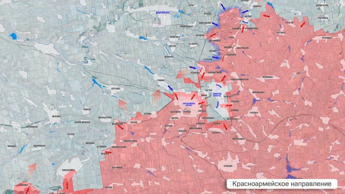 Ранее военные Telegram-каналы сообщили, что ВС РФ продвигаются в направлении центрального района Мирнограда, наши бойцы установили контроль в южной части города.