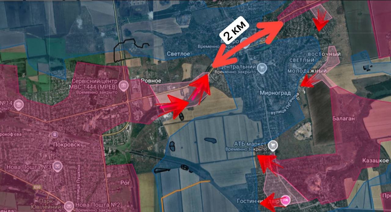 Теперь зона между нашими подразделениями в "горлышке" около 2 км. И это без серой зоны. То есть по сути противник окружен. Поступает информация о том, что штурмовые подразделения ВС РФ, пробившись через опорные пункты ВСУ, вошли в Мирноград со стороны н.п. Ровное.