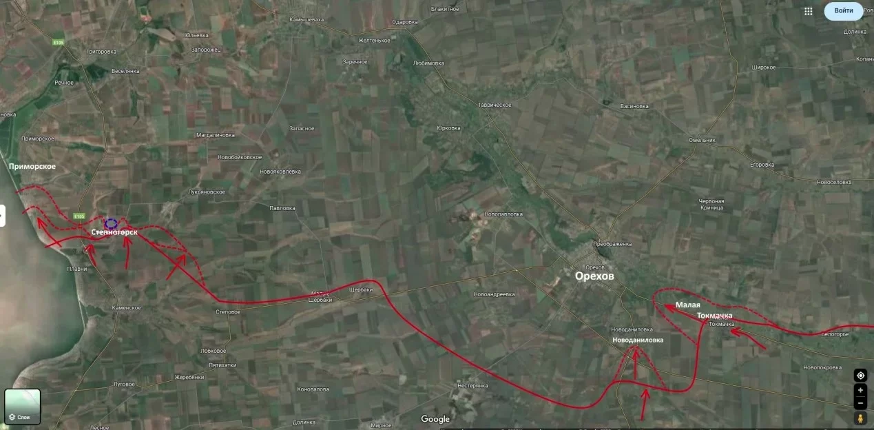 На южном участке фронта наши войска развивают успех. Группировка "Днепр" ведет активные бои в районе Степногорска и Приморского, овладевая ключевыми позициями. В районе Орехова зафиксирован важный тактический успех: кадры объективного контроля подтверждают заход наших штурмовиков в южную часть Новоданиловки и закрепление там. Таким образом, давление на Орехов идет с двух сторон: от Малой Токмачки и через Новоданиловку.