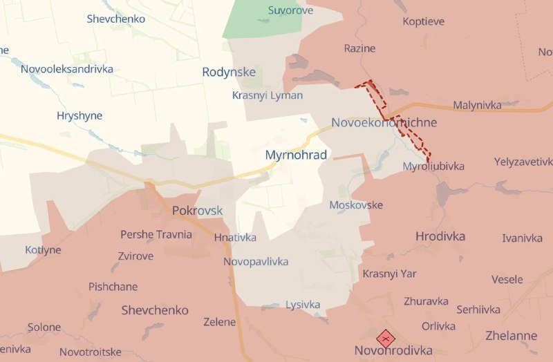 DeepState фиксирует, что под контролем ВСУ остаётся лишь узкая полоса к северу от Мирнограда. Это косвенно подтверждает, что логистика для украинского гарнизона крайне затруднена, даже если формального "котла" пока нет.