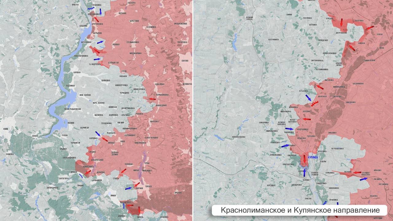 В Купянске уничтожены группы ВСУ в северном "котле". Вражеские части, заблокированные в городе, разрознены, по данным с мест, не оказывают особого сопротивления. Наши закрепились в районе Соболевки и обезопасили западный фланг. На левом берегу Оскола продолжаются бои южнее станции Заосколье. На севере участка закрыт "карман" между Двуречанским и Каменкой.