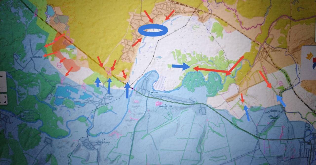 Горловина снабжения восточнее Ямполя сужена до 3+ км, до физического контроля разрушенного моста западнее Закотного — менее 500 м. Идут ожесточённые бои за опорники южнее Ямполя и высоты южнее Закотного; выход на эти высоты создаст оперативное окружение Северска и откроет путь на Славянск.
