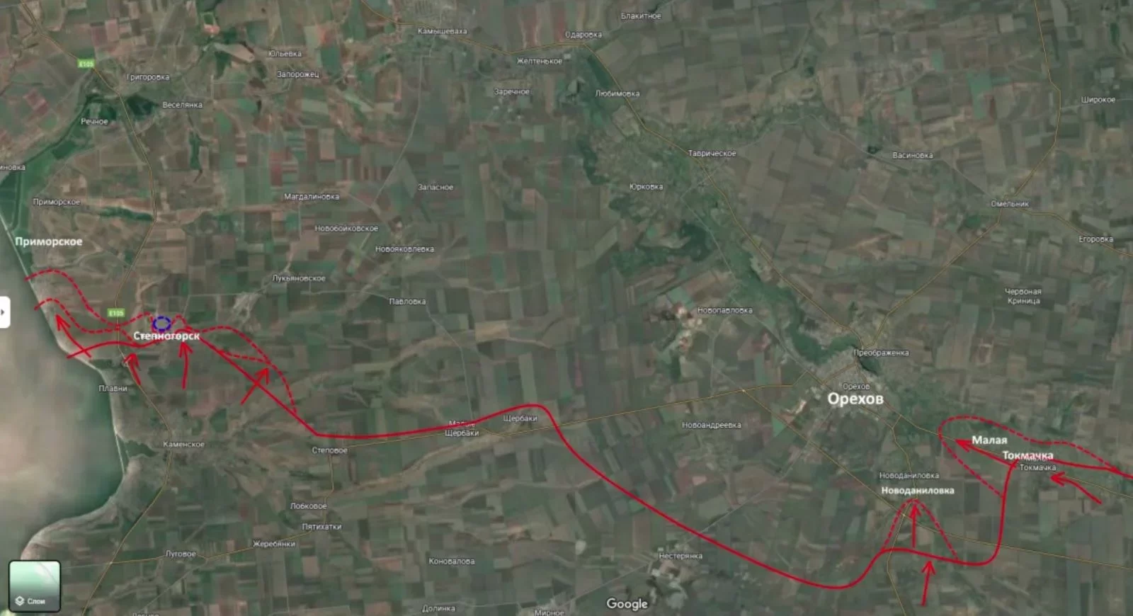 Не менее напряженная ситуация складывается на южном участке Запорожского фронта (линия Степногорск - Приморское - Орехов). Здесь российские войска применяют иную тактику, которую Юрий Подоляка охарактеризовал как "медленное и ползучее" наступление.