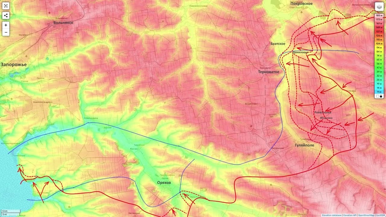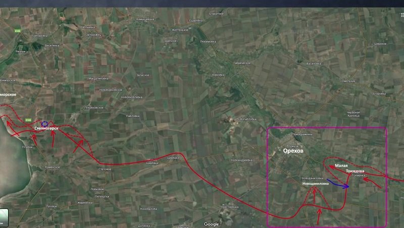 На южном участке Запорожского фронта - Степногорск, Приморское и Орехов - продолжается, как говорит аналитик, "медленное и ползучее" наступление.