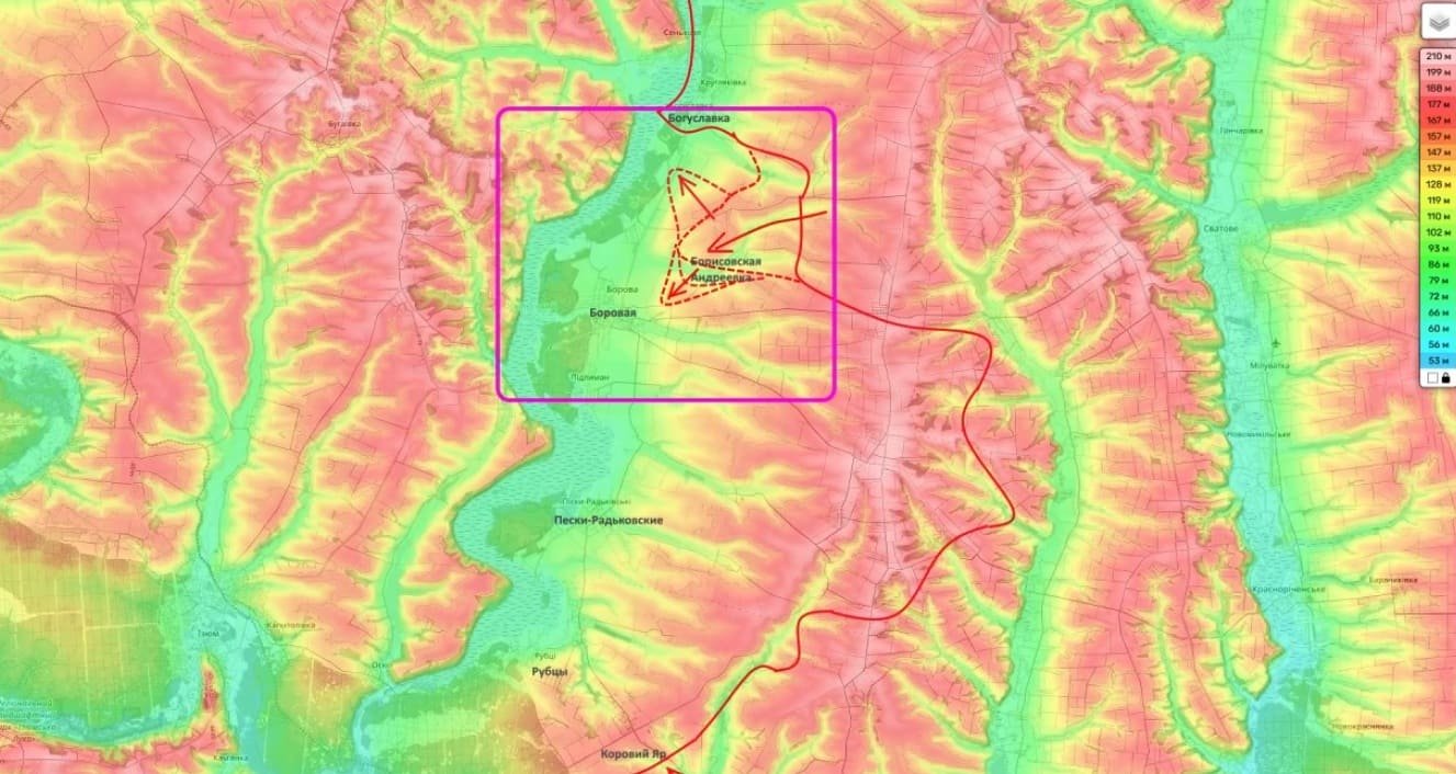 Он сообщил также о ведении российскими военными боев на юге находящегося в 12 километрах от Боровой села Богуславка и на подступах к Коровьему Яру.