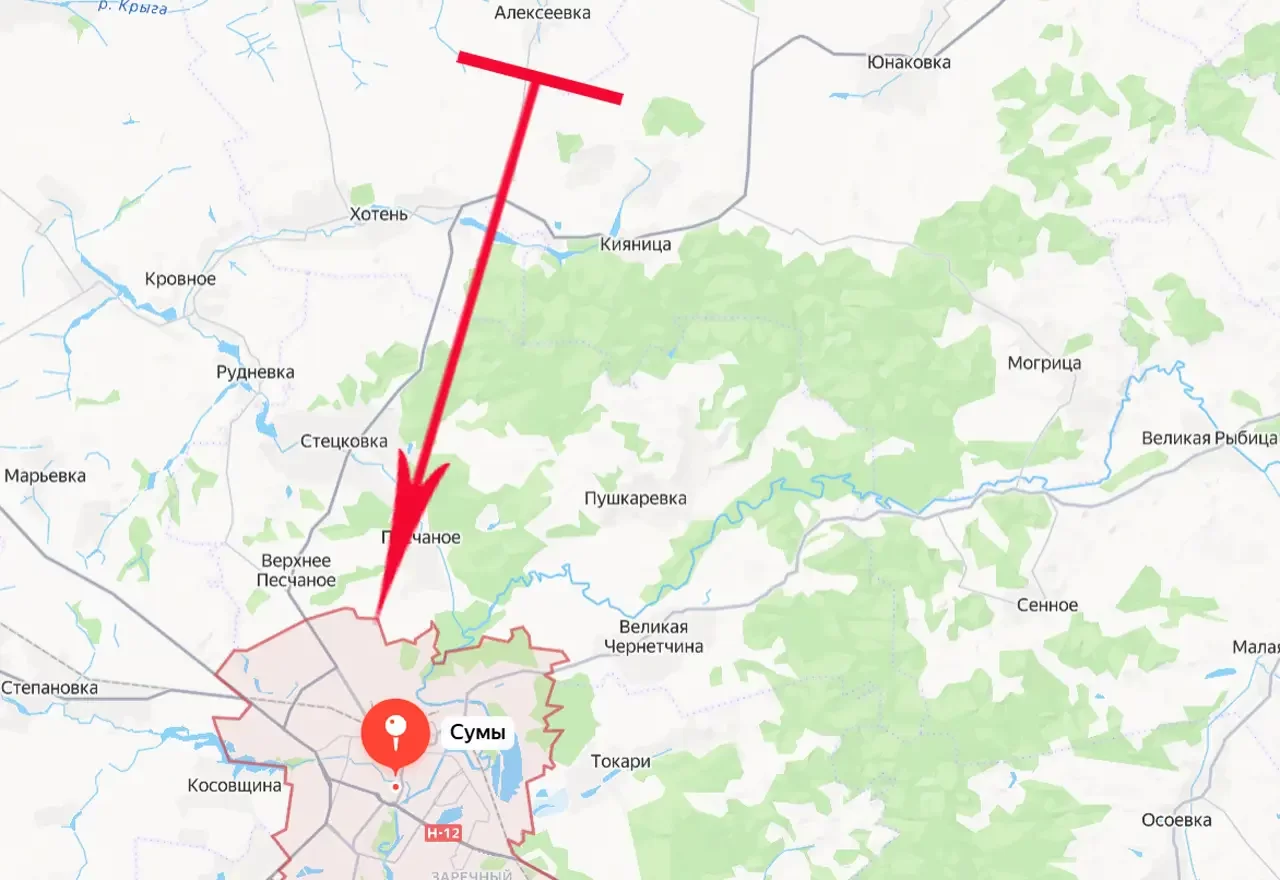 Что касается Сум, то кратчайшее расстояние от передовых позиций россиян в Алексеевке до этого областного центра на северо-востоке Украины составляет примерно 17 километров. До Харькова расстояние составляет чуть менее 18 километров от позиций ВС РФ южнее села Глубокое.