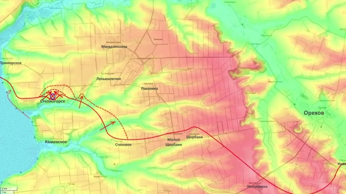 Подразделения группировки "Днепр" добились существенных успехов. К настоящему моменту практически полностью освобожден населенный пункт Степногорск (за исключением небольшого участка на северо-востоке). Развивая успех, российские штурмовики продолжают движение на Лукьяновское.