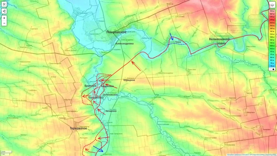 Российские подразделения расширили плацдарм на западном берегу реки Гайчур севернее Терноватого и продвинулись к юго-востоку от посёлка, формируя устойчивый оперативный "мешок".