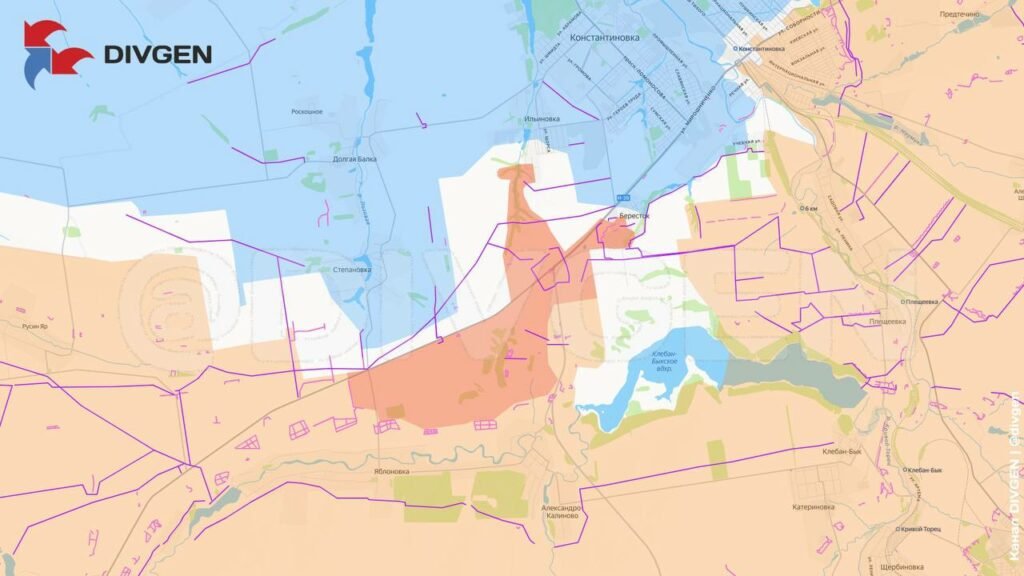 На Константиновском участке идут ожесточённые бои на флангах: российские силы сражаются за опорные пункты на подступах к Степановке и штурмуют южную окраину села Бересток со стороны Иванополья, наши штурмовики вошли в Новодмитровку, противник отступил в лесные массивы южнее.