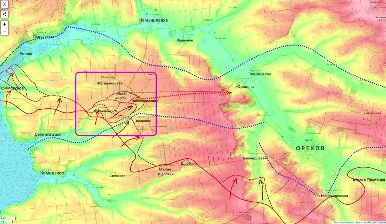 Юрий Подоляка отметил, что существует высокая вероятность форсирования водной преграды. Это создает для командования ВСУ неразрешимую задачу: куда перебрасывать скудные резервы - на удержание линии по реке Конка или на спасение Ореховского участка? Российская армия, сохраняя маневренность, может нанести удар в любом из этих мест.
