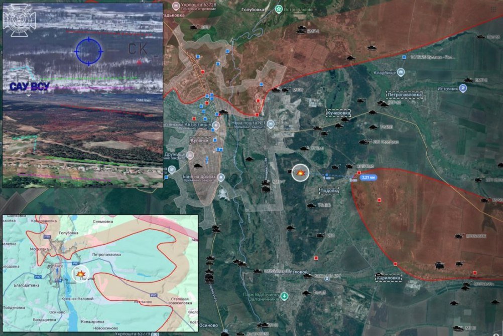 На Купянском участке тяжёлые позиционные бои в городской черте. МО РФ опровергло вчерашнюю информацию ВСУ о том, что противник контролирует здание администрации. На восточном берегу идут бои в районе Подолов и Купянска-Узлового. На северном плацдарме в районе Двуречанского ВС РФ продвинулись в сторону Колодезного.