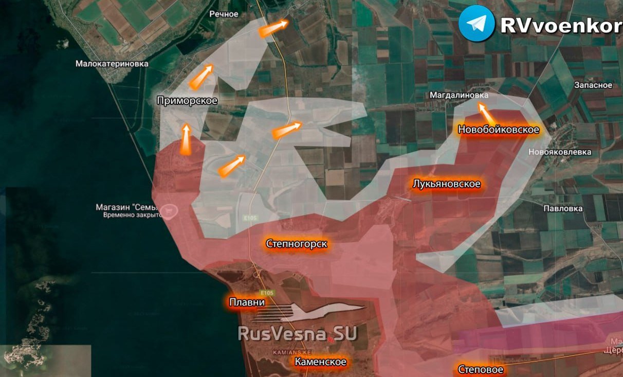 "Военкоры Русской Весны", противник уже фиксирует потери своих операторов БПЛА в районе Магдалиновки. Также отмечено продвижение российских сил между Приморским и Ореховом, в районе Павловки.