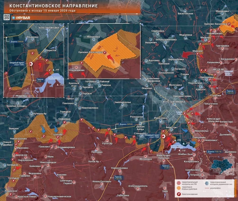 Красноармейское направление после освобождения города Красноармейска всё ещё отличается повышенной интенсивностью боевых действий. Бойцы Вооружённых сил Российской Федерации (ВС РФ) постепенно продвигаются и регулярно освобождают новые территории в Донецкой Народной Республике (ДНР). Свежие новости из зоны СВО, карта боевых действий, сводка боевых действий на пятницу, 16 января 2026 года, - в материале нашего сайта N4k.Ru.