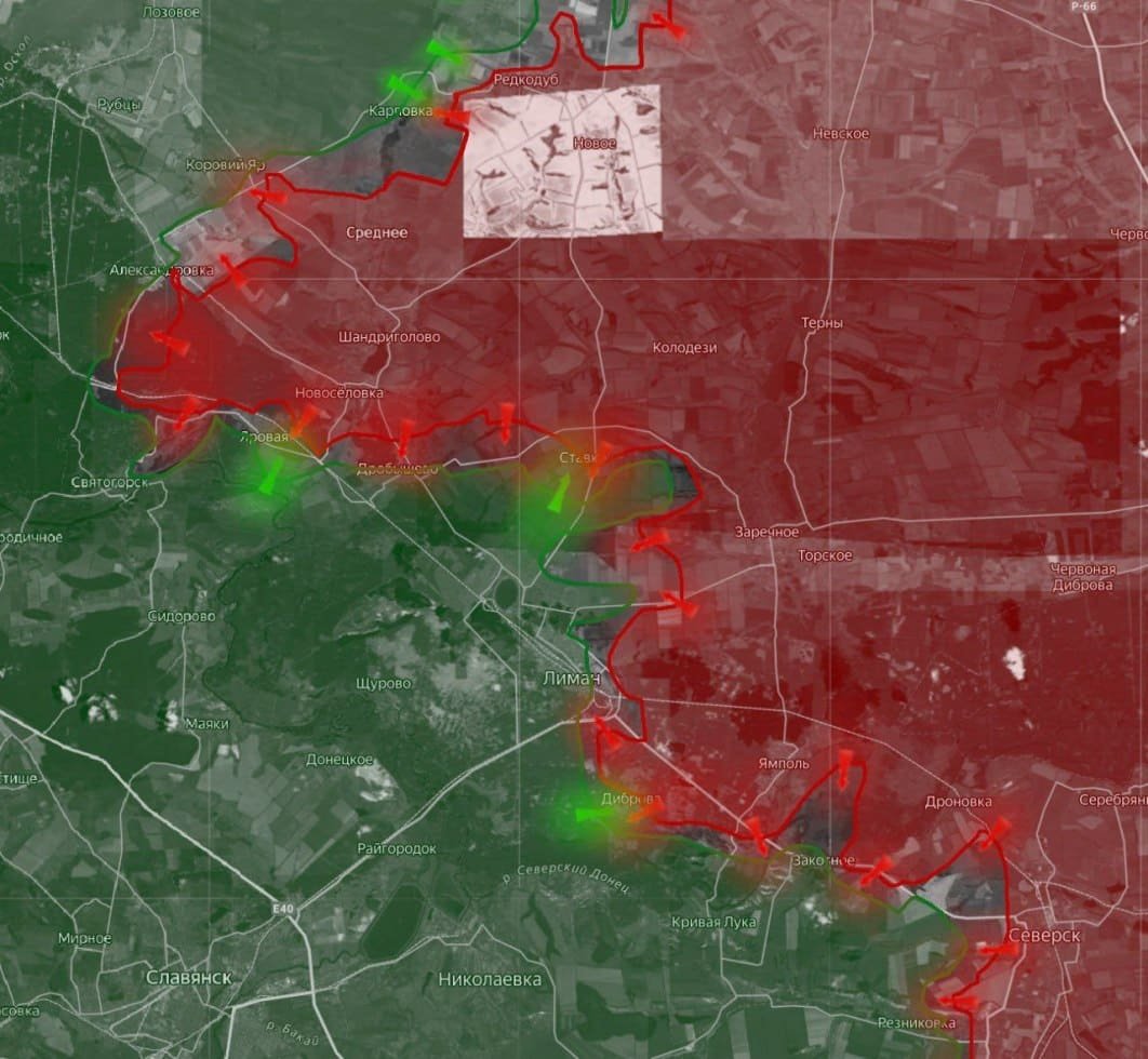 На Краснолиманском фронте ВС РФ расширяют зону контроля в районе Александровки, Святогорска и Яровой. Также ведут бои на восточных окраинах Красного Лимана. Выше по карте в районе Боровой ВС РФ выравнивают линию фронта, закрывая остававшиеся там "карманы".