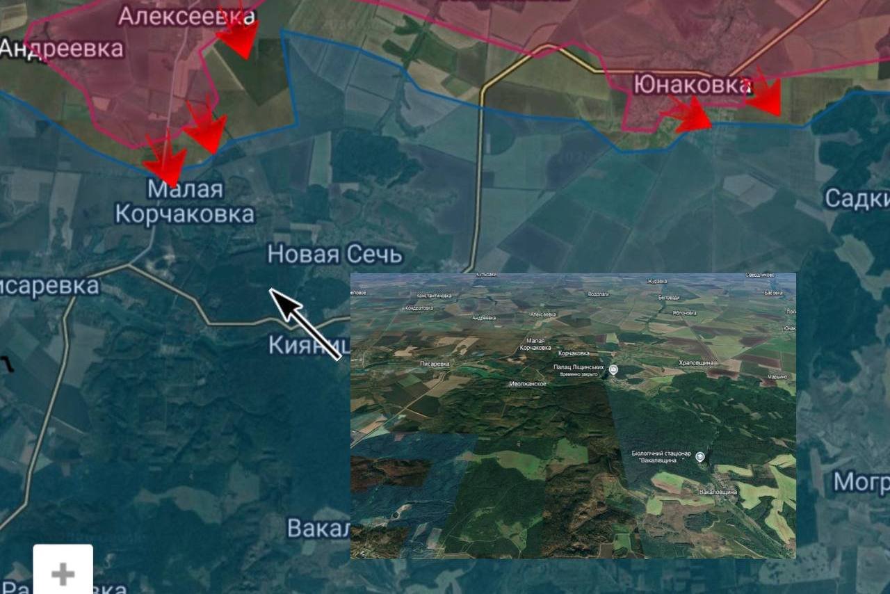 В районе Алексеевки мотострелки продвигаются к Малой Корчаковке, преодолевая сопротивление в лесных массивах на высотах. Несмотря на превосходство ВСУ в тяжёлых дронах ("Баба Яга", R-18), российская артиллерия и авиация эффективно уничтожают позиции противника.