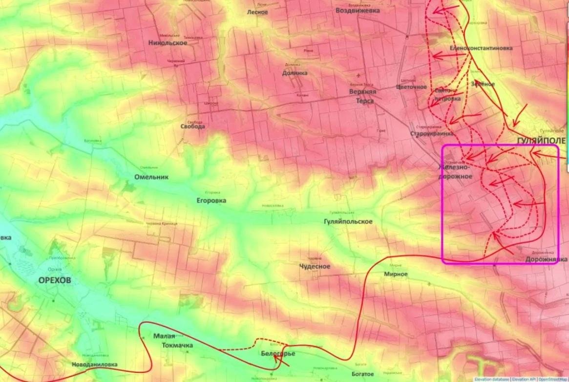 Особую активность проявляет группировка войск "Восток", действующая юго-западнее Гуляйполя. Здесь зафиксировано продвижение: занято несколько полей, наши штурмовики приблизились к населенному пункту Железнодорожное, пытаясь зайти в него с востока. Аналогичные тактические успехи достигнуты в районе Староукраинки и Цветочного.