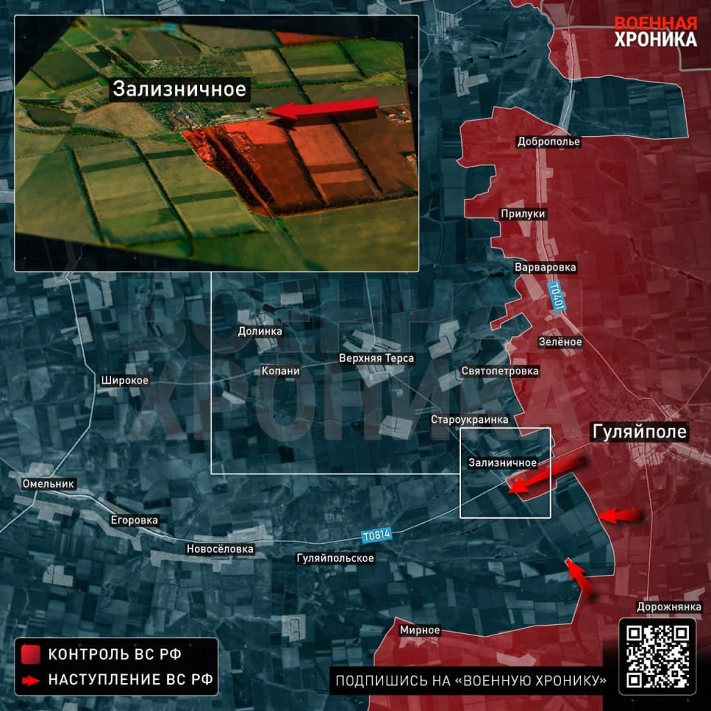 На соседнем Гуляйпольском участке инициатива также в руках российской армии. Бойцы ВС РФ успешно отбили серию контратак в районе Гуляйполя и Покровского и перешли в наступление, пробиваясь к Зализничному сразу с востока и юга. Поступают сообщения о работе наших диверсионно-разведывательных групп (ДРГ) уже на южных окраинах поселка, однако говорить о полноценном закреплении пока преждевременно, информирует Олег Царёв в своём