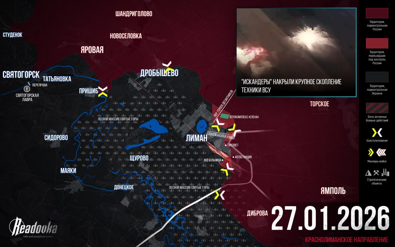 ВС РФ продвигаются от Красного Лимана к Славянску, выбив противника из опорных пунктов вокруг Красного Лимана и окружив его. Наступление активно ведётся в южной и юго-восточной частях Красного Лимана, где бойцы заняли позиции в Коммунальном и усиливают давление на врага. Сейчас главной целью является выравнивание ЛБС и укрепление позиций для дальнейшего охвата.