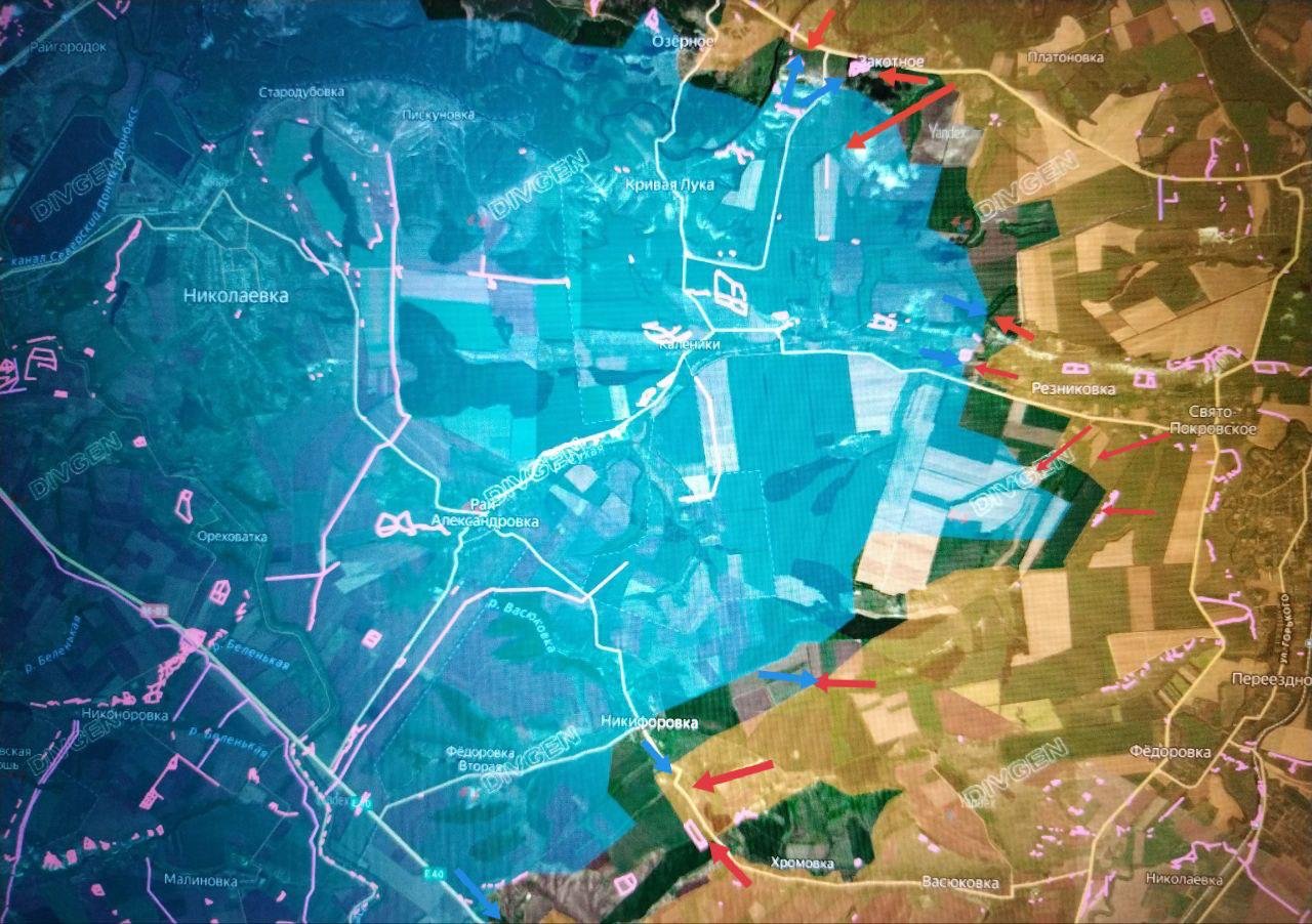 Группировка "Юг" ведёт успешные бои за высоты в районе Закотного - Кривой Луки - Резниковки. Также ВС РФ продвинулись в самой Резниковке и заняли позиции противника, с которых враг пытался контратаковать наших бойцов в этом посёлке и Кирово (оно же Свято-Покровское). Соответствующие данные обнародовал военкор Юрий Котенок в своём