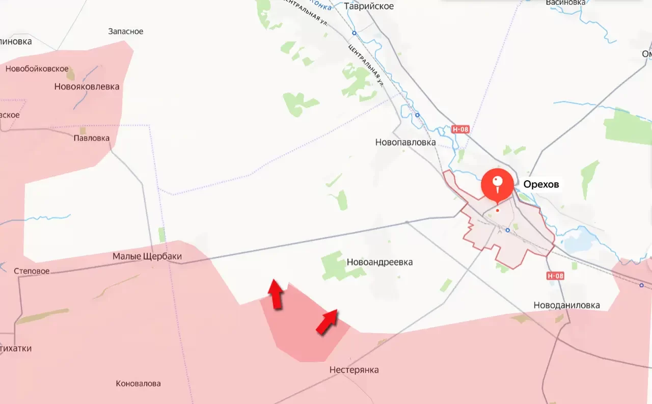 Напомним, что северо-западнее Орехова российские штурмовые группы подошли к населённому пункту Запасное, что в 8 км от автомобильной дороги Орехов-Запорожье. Такое расстояние позволяет создать значительные проблемы для противника, использующего эту дорогу (Н-08) для снабжения Ореховского гарнизона, пишет