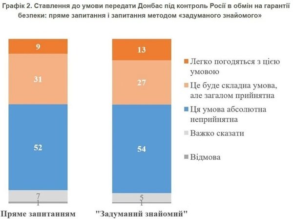 Впрочем, из 40%, считающих, что пора отдавать Донбасс, лишь 9% даже не переживают по поводу такой перспективы. Еще 31% - те, кто полагает, что условие, конечно, неприятное, тяжелое - но деваться некуда, надо на него соглашаться. 52% категорически отвергли возможность капитуляции, а остальные 8% либо отказались от ответа, либо не имеют конкретного мнения.