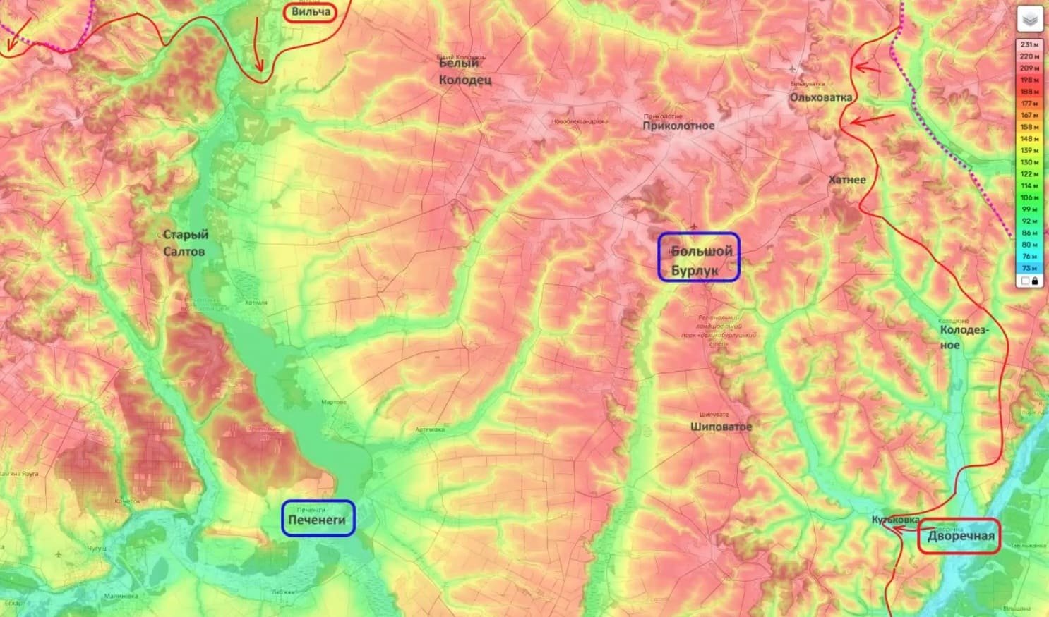 В Харьковской области на БольшеБурлукском участке фронта становится всё более очевидным желание российских войск навязать противнику большое сражение с задачей очистить полностью от Вооружённых сил Украины (ВСУ) восточный берег реки Северский Донец до населённого пункта Печенеги.
