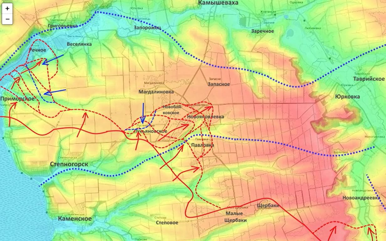 "Мы прорвали главную линию обороны, которую противник возводил на протяжении нескольких лет, которая была у него здесь главной. И опять же, опасность нашего дальнейшего движения на Камышеваху, а также переправа через реку Конка, а там далее уже буквально чуть более 10 км до окраин Запорожья. ВСУ получили команду нанести контрудар. С учётом того, что опереться противник на южном берегу реки Конки мог только на Веселянку и Магдалиновку, именно сюда перегруппировалась часть штурмовых полков, которые были переброшены с севера, и первый удар, который был нанесён, - по Лукьяновскому, в основание нашего выступа", - отметил блогер.