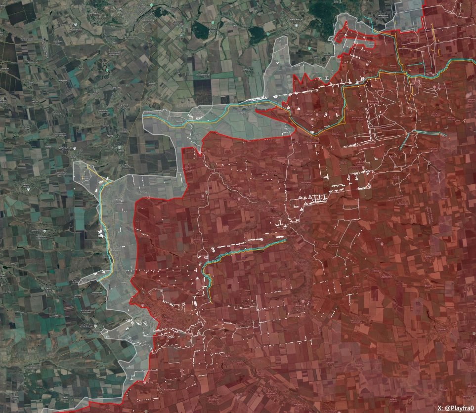 Есть продвижение на северных окраинах, а также южнее Ставков и в восточной части Дробышево. Бои продолжаются у Святогорска и Александровки. В лесах вдоль Оскола идут зачистки и атаки на укреплённые позиции в направлении Боровой.