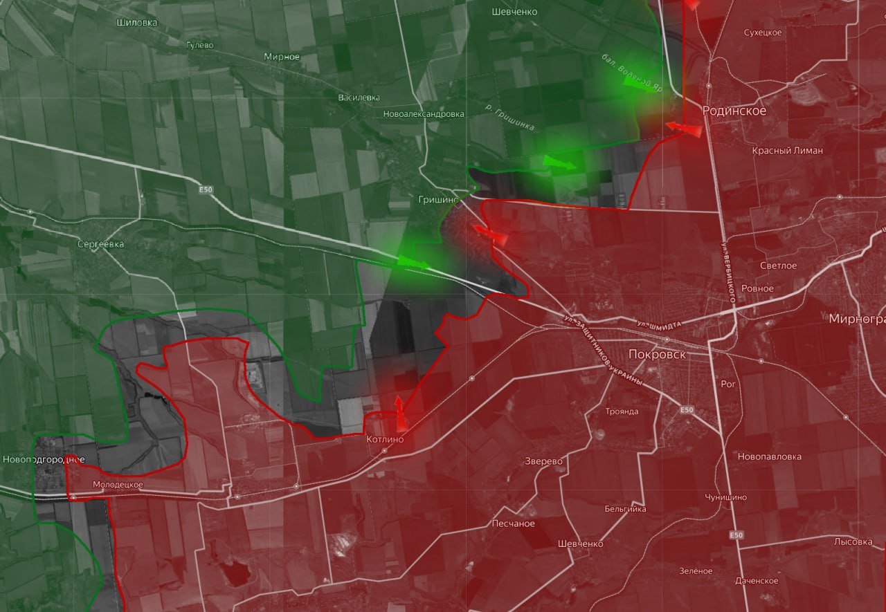 На Красноармейском направлении обстановка характеризуется отражением контратак противника и удержанием инициативы. Войска РФ успешно отражают вражеские атаки на участке Молодецкое-Удачное, одновременно увеличивая зону контроля территорий севернее Удачного. Продолжаются ожесточённые бои в Гришино и на линии боевого соприкосновения на Добропольском выступе.
