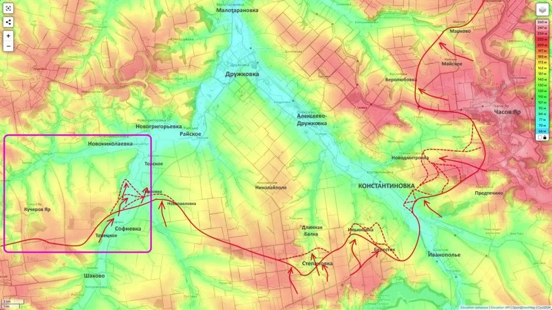 На Константиновском направлении подтверждён повторный заход российских штурмовых групп в юго-западную часть Константиновки. Закрепление идет в районе высотной застройки через Бересток и Ильиновку. Теперь штурм города ведется с двух направлений - с юго-востока и юго-запада, что критически усложняет положение гарнизона ВСУ.