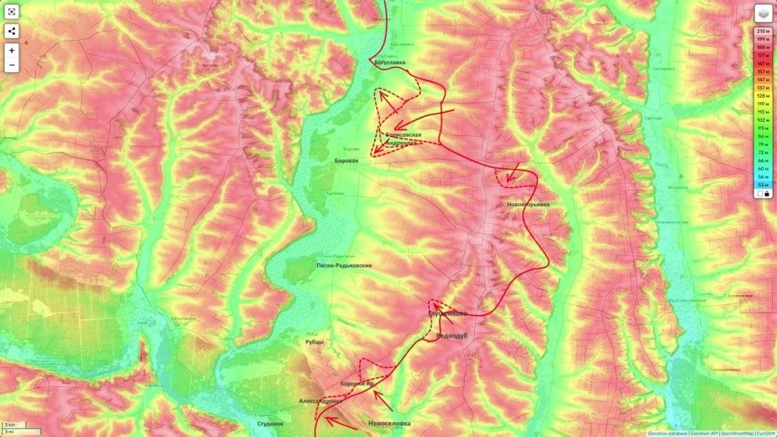 Развивается движение на Рубцы и Коровий Яр. Цель - выход к реке Оскол для разрезания боровской группировки ВСУ и перекрытия путей снабжения.