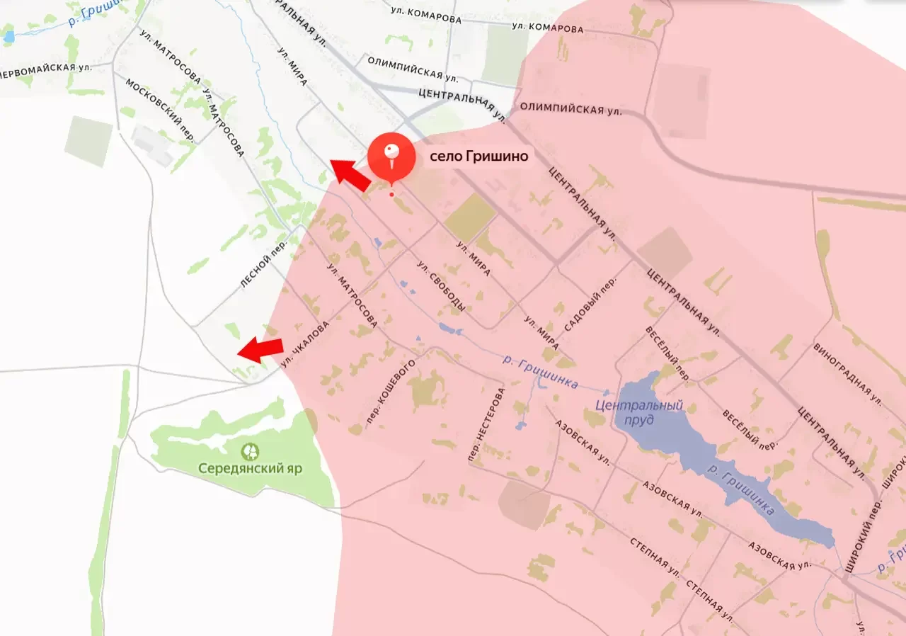 На западе противник отброшен за Середянский яр. На севере ВС РФ достигли окраины Гришино, выйдя к реке, давшей название селу - Гришинка, уточняет