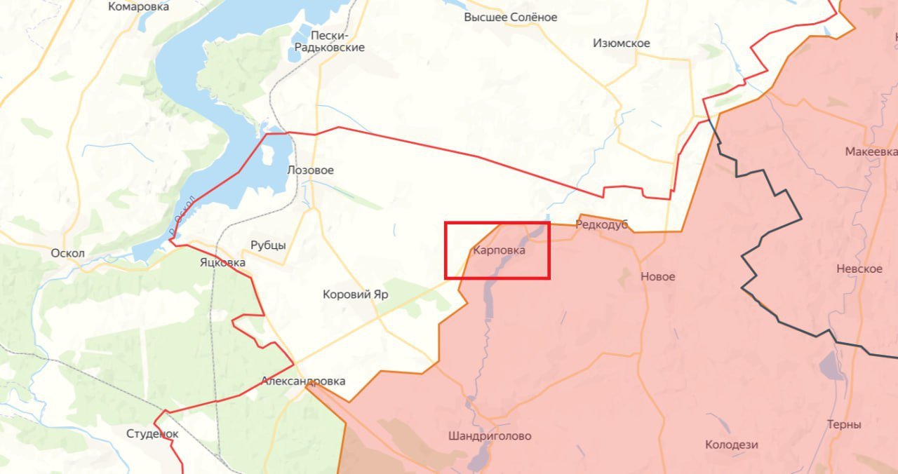 Минобороны сообщило об освобождении Карповки - села с довоенным населением около 400 человек, расположенного по обе стороны реки Нитриус. Продвижение от плацдарма Среднее–Карповка через рубеж Волчий Яр, Коровий Яр, Лозовое, Рубцы и Крымки открывает перспективу движения к Осколу и Изюму.