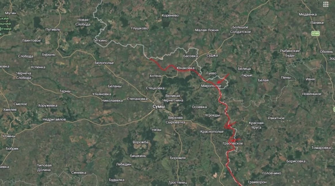 "Сумское направление. Здесь наши войска продолжают теснить противника. И всё более очевидно, что формируется так называемая новая защитная полоса. Но на самом деле это южный охват Сум", - проинформировал он.