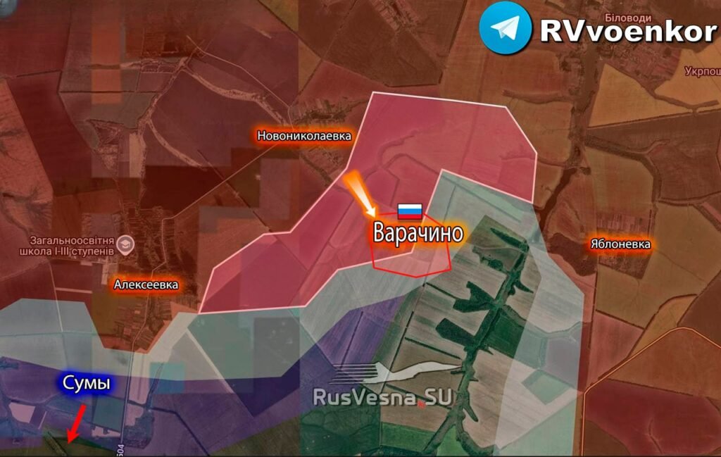 Оперативная обстановка на Сумском направлении для ВСУ стабильно ухудшается, у российских войск новые успехи. Восточнее Алексеевки и южнее Новониколаевки российские войска заняли ряд лесополос и фактически выбили ВСУ из района населённого пункта Варачино, ранее отбитого противником в ходе весенне-летнего контрнаступа.