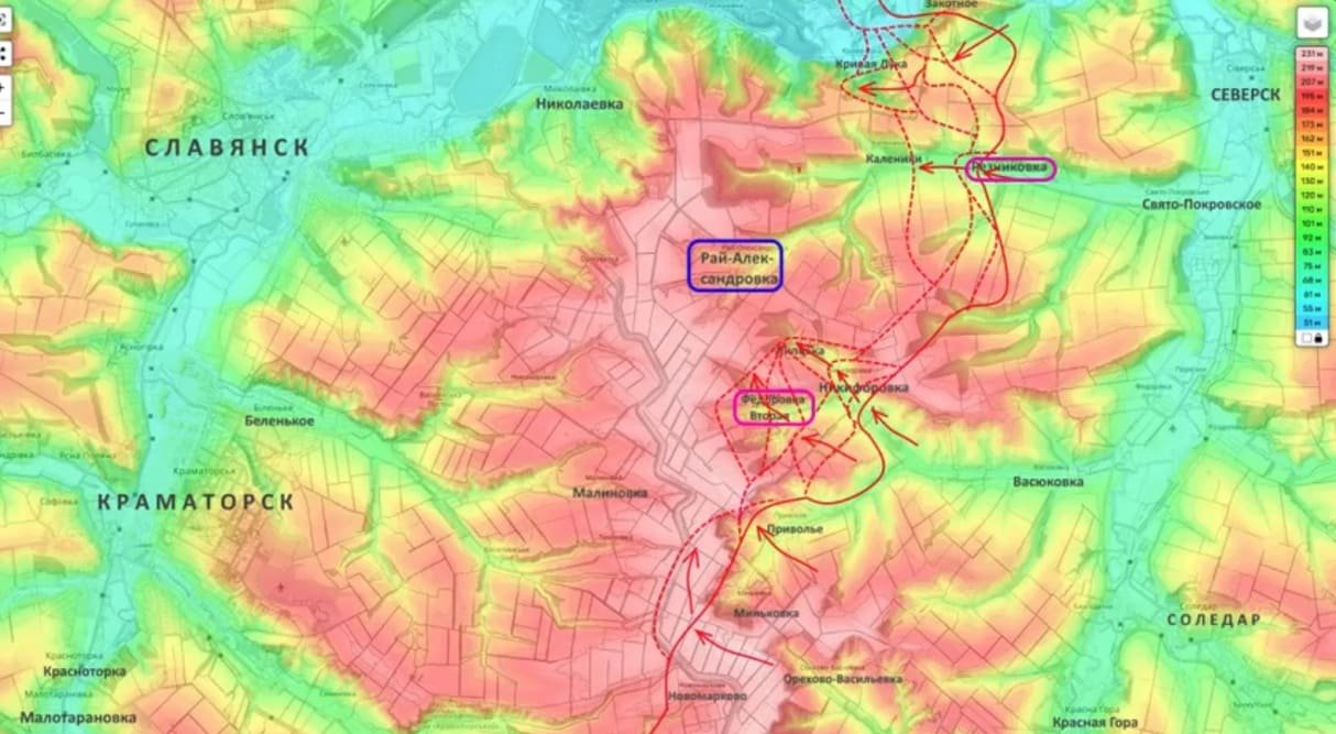 Заметные изменения происходят и на Славянско-Краматорском направлении. По информации Подоляки, российские силы, опираясь на освобождённую Липовку, ведут бои во Второй Федоровке и зачищают балки к югу от Александровки. Подготовка, как утверждается, ведётся к выходу на господствующие высоты в районе Калиновки и Кривой Луки.