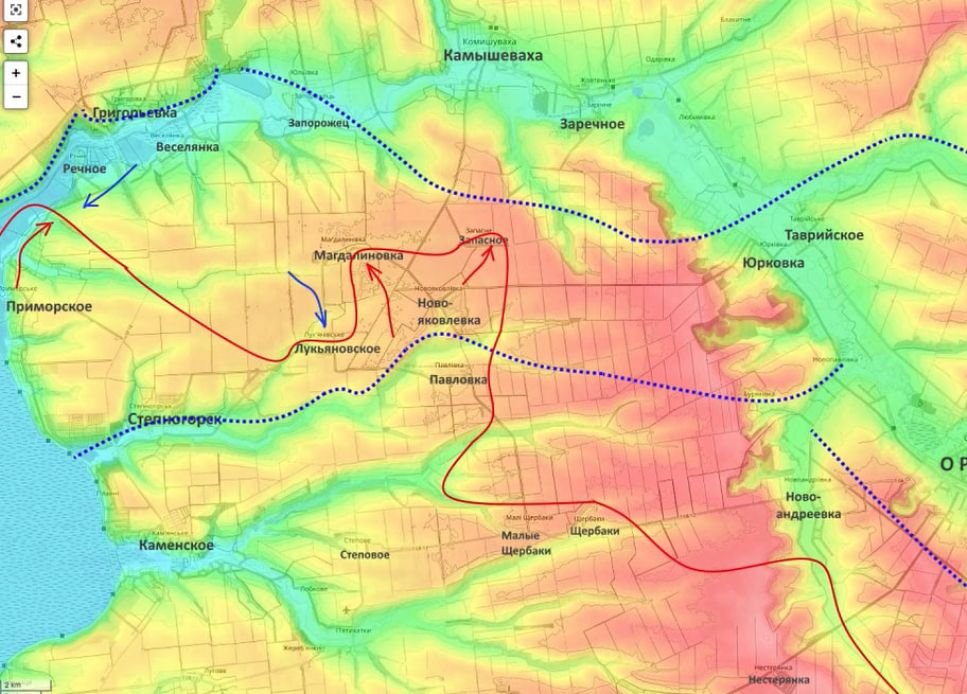 "ВСУ не удалось отбросить ВС РФ за реку Гайчур. Более того, на западном участке русские заходят в тыл украинской обороны. На северном фланге ВСУ остановились по линии Даниловка - Вербовое - Березовое до линии обороны, которую заняли российские бойцы во время осеннего наступления. На северо-востоке бои за Терноватое. На восточном плацдарме Доброполья ВС РФ продвинулись в сторону Риздвянки. А в плацдарме Староукраинки - в Железнодорожное, заходя в тыл обороне ВСУ", - сказал Стариков.
