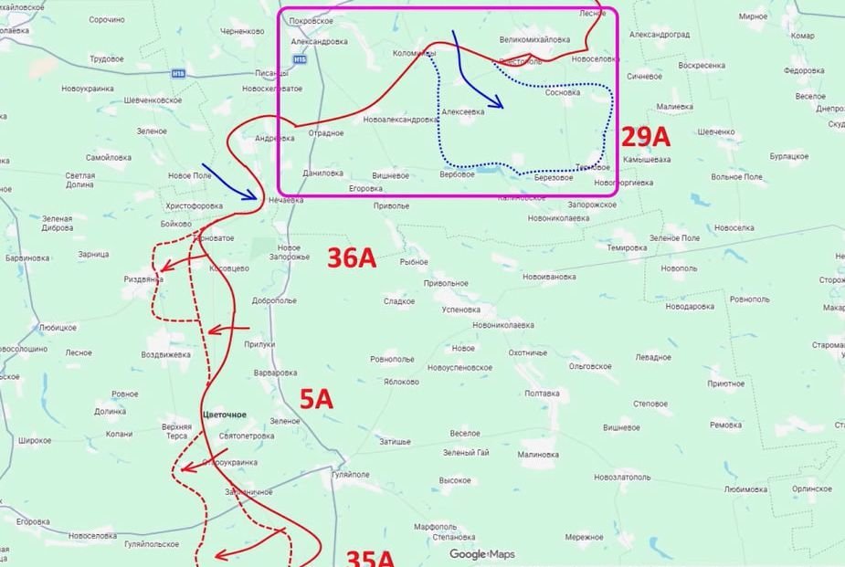 "В полосе группировки "Восток" ситуация плюс-минус такая же. Наши подразделения 35-й и пятой армии из района Гуляйполя продолжают атакующие действия по направлению к Верхней Терсе, продолжают охват этого населённого пункта и попытки закрепления уже на его территории", - уточнил блогер.