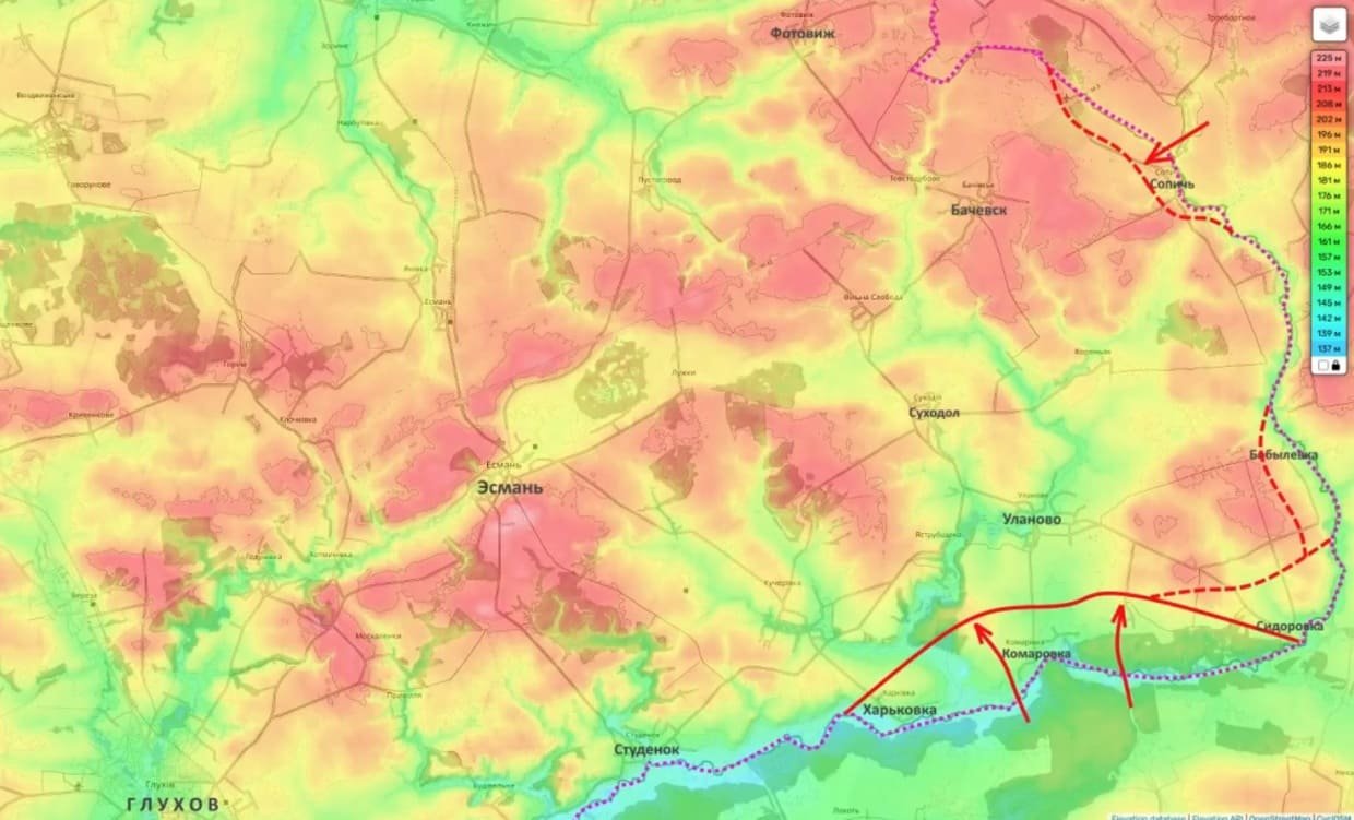 "Наши подразделения полностью заняли населённый пункт Сопычь и, таким образом, пытаются выйти на линию Бачевск - Уланово", - уточнил блогер.