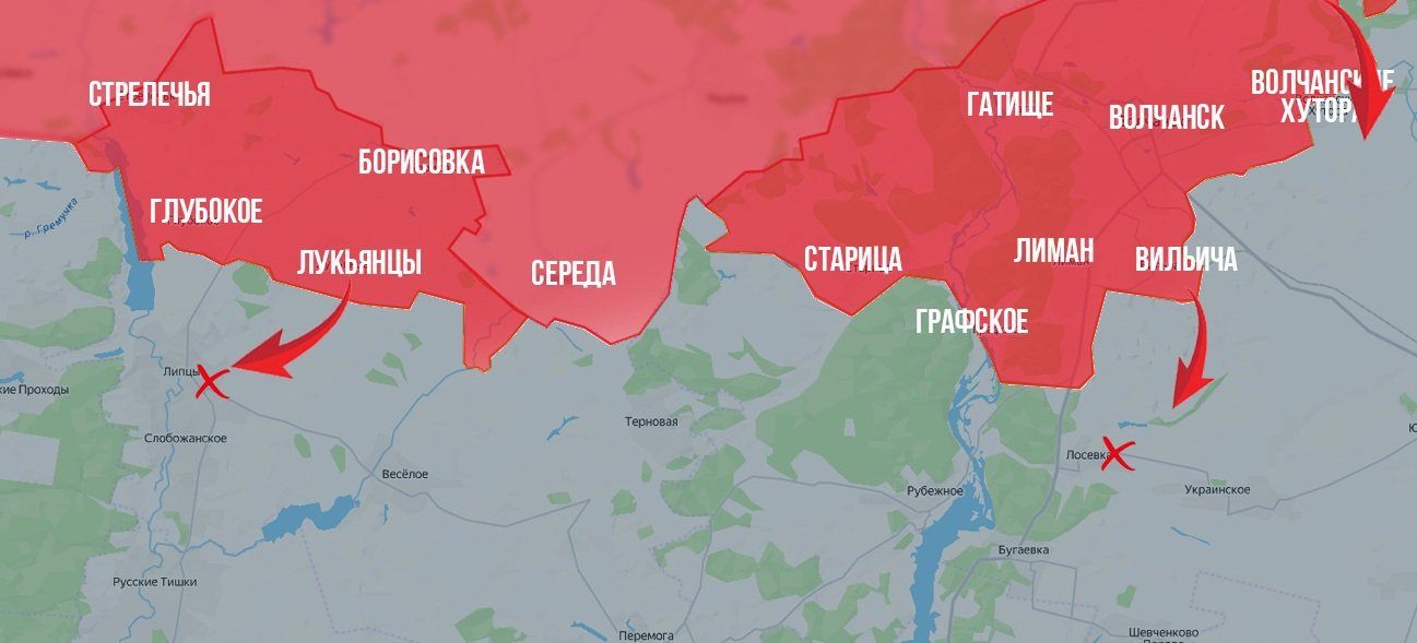 На Харьковском фронте ВС РФ зачищают Волчанские Хутора, выбивая противника из капитальных строений. Фиксируется продвижение к югу от города - к Избицкому и Верхней Писаревке.