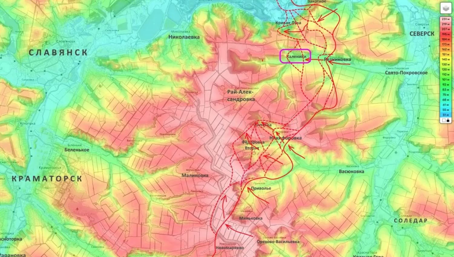 Освобождение Калеников позволяет развивать наступление как на запад к Рай-Александровке, так и на северо-запад - к низине между Пескуновкой и Кривой Лукой. В самой Кривой Луке прямо сейчас идут ожесточенные бои. Если ВС РФ окончательно займут низину, украинские подразделения на высотах окажутся в тактическом окружении.