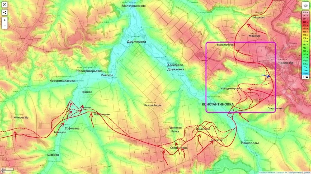 На Константиновском направлении ставка сделана на разрушение логистики. Удары по двум дамбам критически усложнили снабжение ВСУ. Воспользовавшись этим, российские части заняли ключевые лесополосы между Ильиновкой и Долгой Балкой.