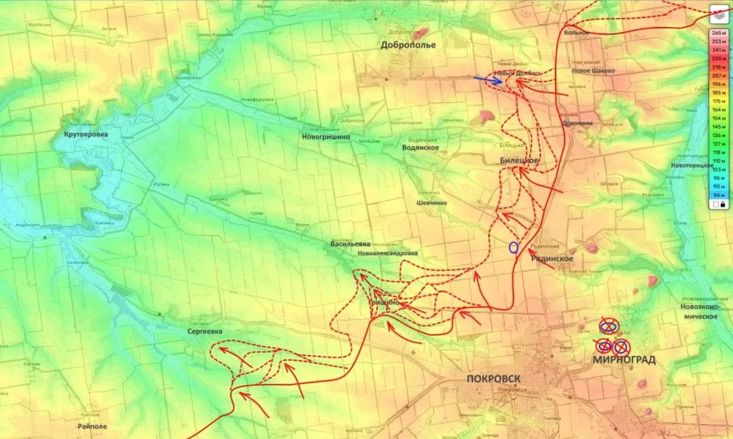 В полосе группировки войск "Центр" российские войска в районе Покровска и Доброполье ведут ожесточённые боевые действия вдоль всей линии фронта, которая на данном участке фронта явно не выражена и представляет из себя по большей части серую зону.
