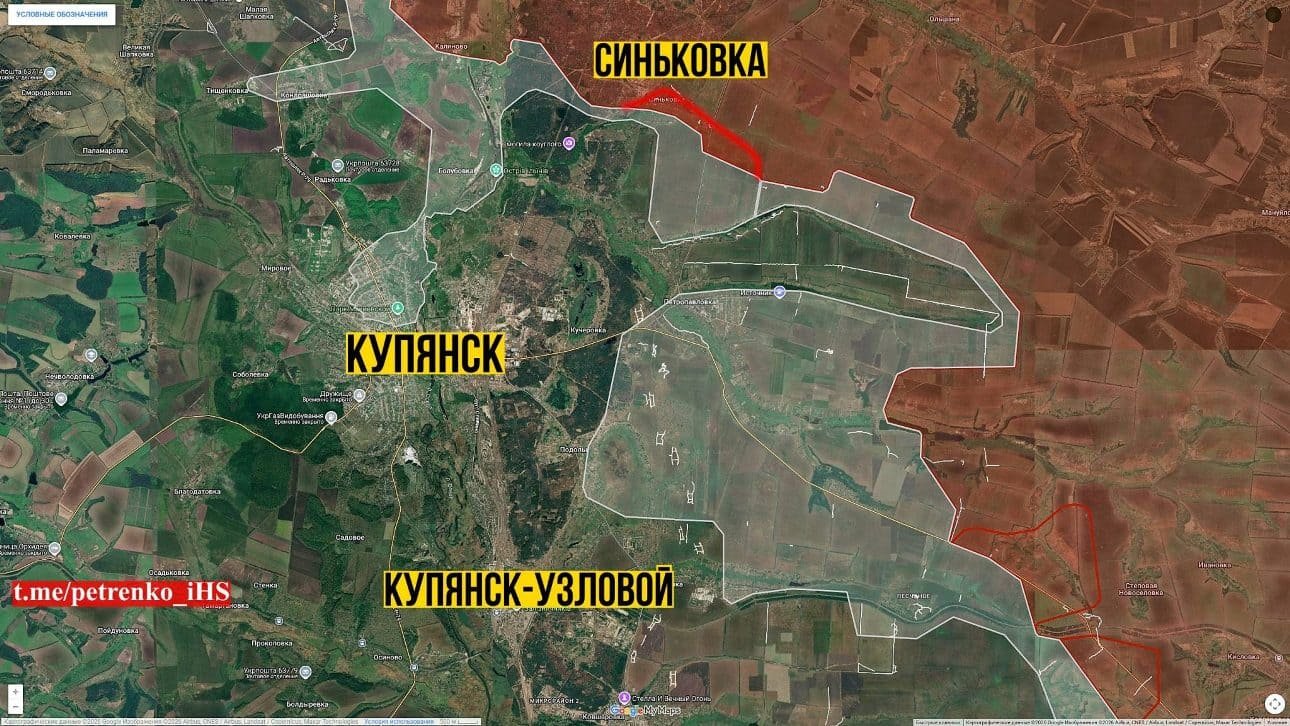 Зафиксировано продвижение в районе Купянска-Узлового - севернее Песчаного и в сторону Куриловки. Также есть тактические изменения к югу от Куриловки в направлении на Ковшаровку. Войска РФ занимают новые позиции восточнее Петропавловки. Основная цель предпринимаемых действий - создание условий для охвата населённого пункта Купянск-Узловой с южного направления.